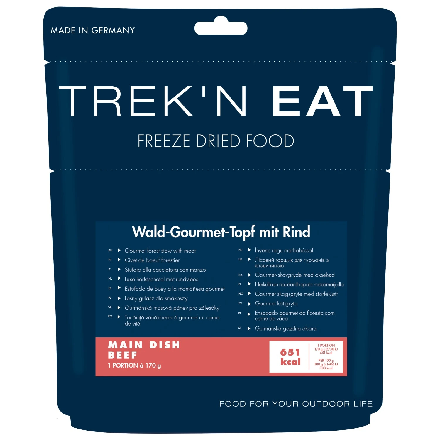 Wird man unterwegs hungrig, dann ist das Gourmet Forest Stew with Meat Gericht von Trek’n Eat eine gute Wahl! Die Trekkingmahlzeit wird mit 320 ml heißem Wasser zubereitet. Im Handumdrehen ist das deftige Essen fertig! Guten Appetit!