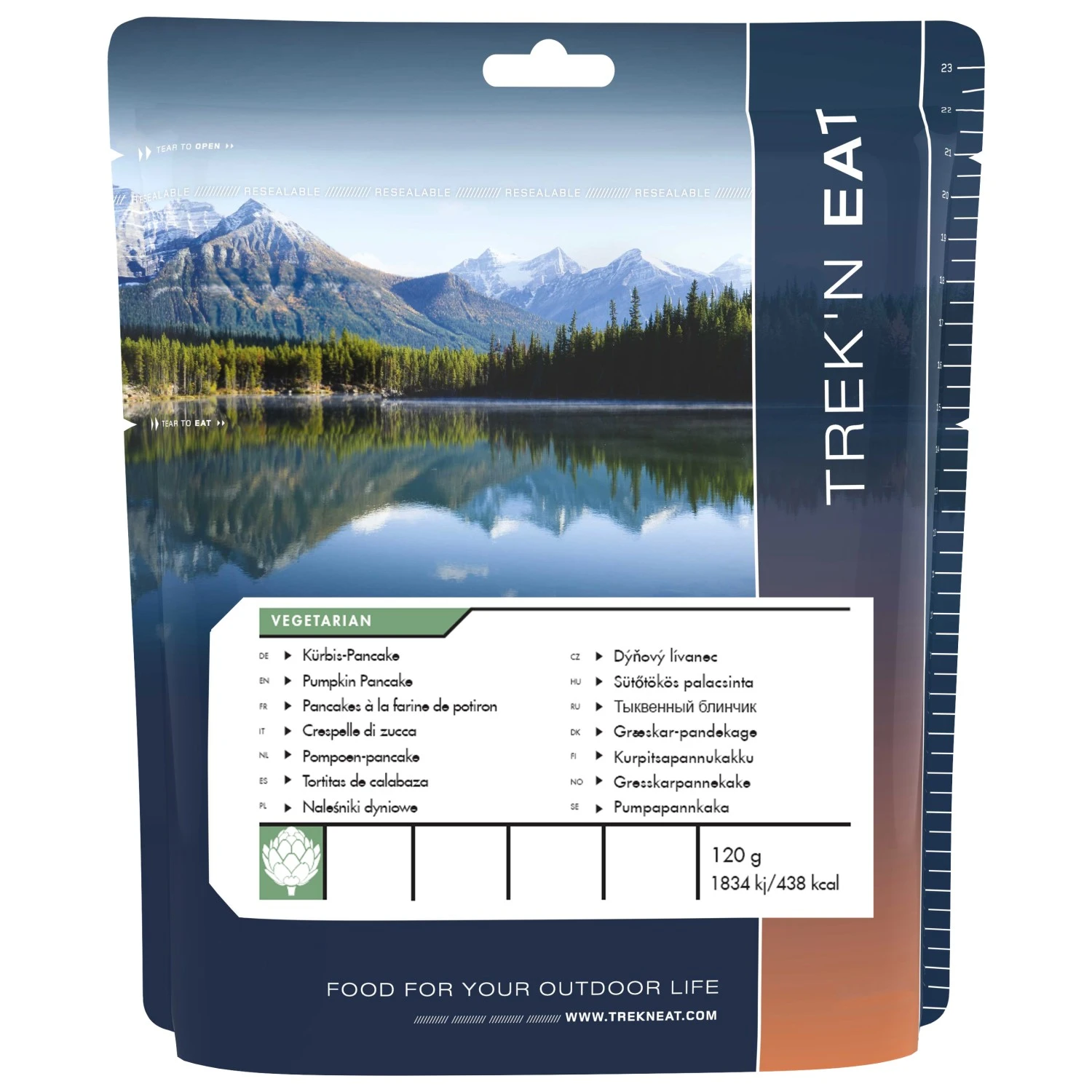Mit der Outdoor-Mahlzeit Kürbis-Pancake von Trek’n Eat bist Du bei Deinen kleinen und großen Outdoor-Abenteuern gut versorgt! Für die Zubereitung gießt Du 140 Milliliter kaltes Wasser in den Beutel, rührst gut um und lässt das Ganze für ca. fünf Minuten ziehen. Dann kannst Du die Pancakes in der Pfanne anbraten. Guten Appetit!